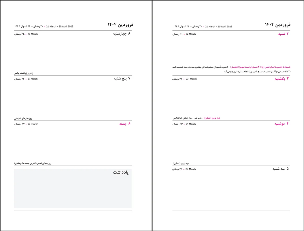 - برنامهریزیهای روزانه، هفتگی، ماهانه، سالانه و ثبت یادداشت
