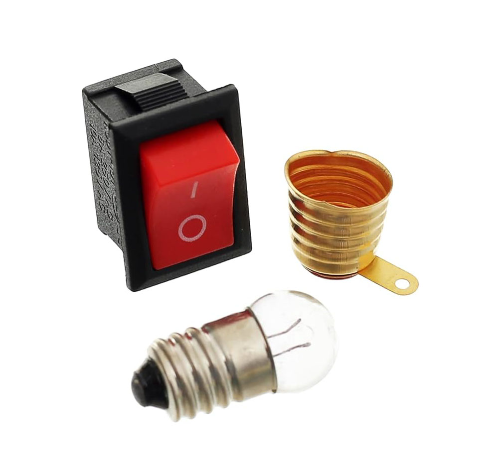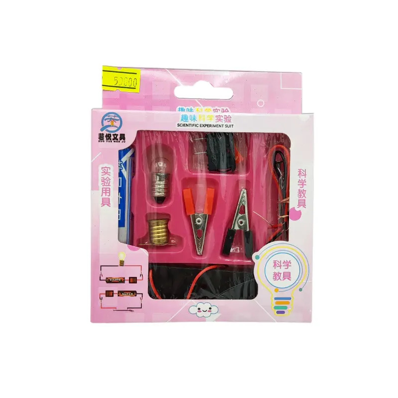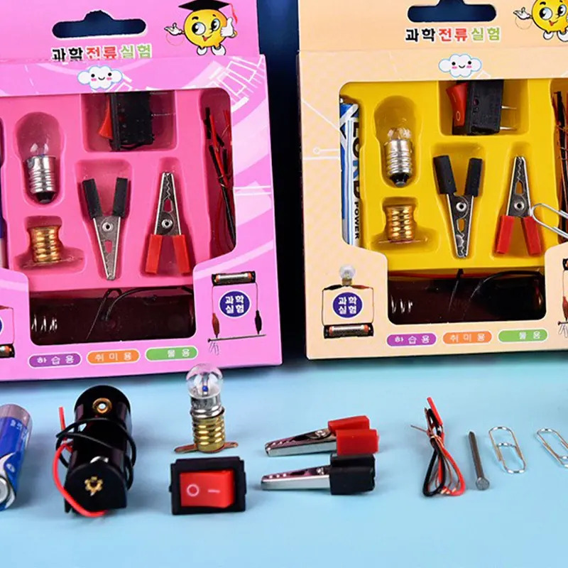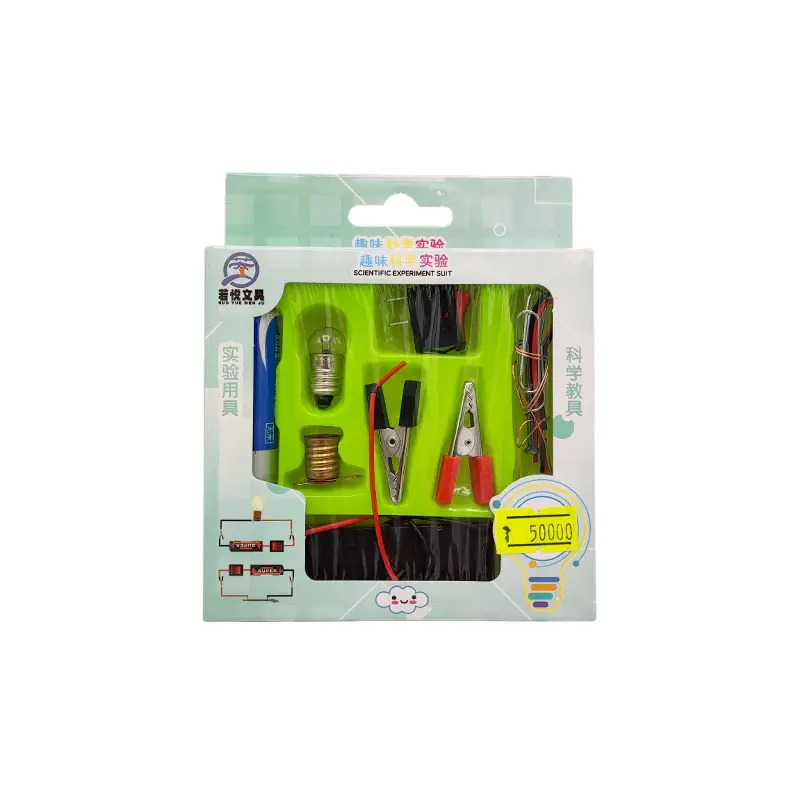1 عدد باتری قلمی - جای باتری - سیم مسی و روکش دار - لامپ - سرپیچ - کلید - 2 عدد گیره سوسماری سر باتری - میخ - گیره کاغذ